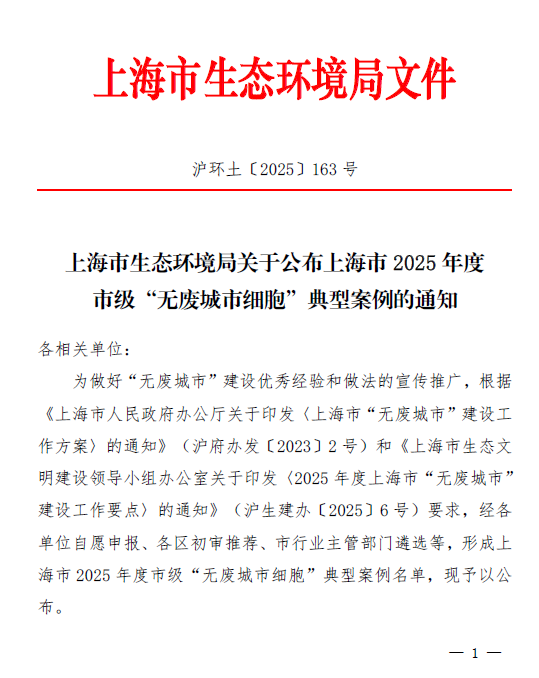 点击阅读原文,查看《上海市生态环境局关于公布上海市2025年度市级“无废城市细胞”典型案例的通知》(沪环土〔2025〕163号)
